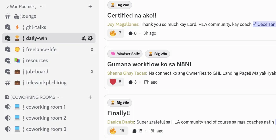 Ang pinaka-nagustuhan ko talaga dito sa High Level Accelerator ay yung support ng community. Para talagang naging Facebook ko yung Discord, kasi halos araw-araw akong tambay sa coworking channels, browse browse ng mga posts, basa-basa ng mga wins para lalong mamotivate and mainspire.